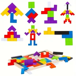 Set di blocchi colorati in legno per creare forme e figure. - Pezzi di varie forme e colori vivaci. - Base in legno per incastrare i pezzi.