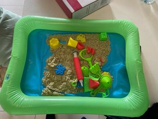 Vendo simpatica vasca per giocare con la sabbia, ideale per bambini. È leggera e facile da riporre. - Vasca gonfiabile di colore verde e azzurro. - Perfetta per giocare in casa o in giardino. - Include diversi giocattoli per la sabbia.