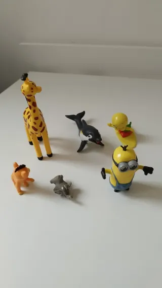 Lotto composto da 6 personaggi e animaletti giocattolo. .1 Minion (Cattivissimo Me) in plastica rigida. 1 Titti (Tweety) surfista su tavola gialla. 1 Giraffa alta, stile classico. 1 Orca marina. 2 Piccoli abitanti della savana: un leoncino arancione e un elefantino grigio.