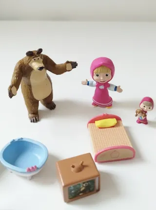 Simpatico set di figurine ispirato al cartone animato Masha e Orso. Perfetto per completare la casetta di Orso o per giocare a ricreare le scene della serie! Il lotto include tutto quello che vedi in foto: Personaggi: Orso, Masha e Masha mini con bambolina. Accessori: Letto, TV vintage, vasca da bagno, sdraio viola, baule verde e secchiello. Condizioni: Ottime, come da foto. I personaggi stanno in piedi da soli e i colori sono ancora vivaci. Spedizione: Rapida e imballaggio curato. Ideale come regalo per bambini o per collezionisti del genere.