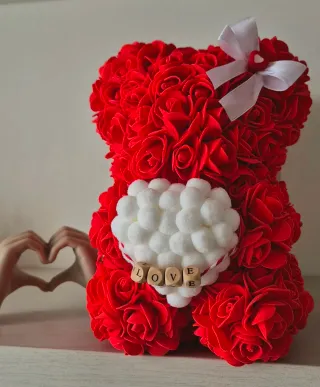 Orsetto decorativo realizzato con rose rosse artificiali, perfetto per un regalo speciale.Alto 22 cm con la scatola 28cm - Rose rosse in schiuma - Dettaglio a forma di cuore bianco sul petto. - Scritta LOVE in cubetti di legno. - Fiocco bianco sul capo.