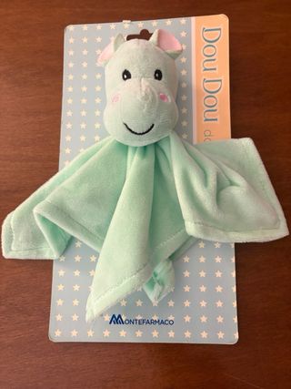 Dentinale Dou Dou Ippopotamo di Montefarmaco, un morbido peluche per bambini. Progettato per accompagnare i bambini durante la dentizione e il sonno. Nuovo sigillato