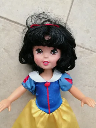Bambola ispirata al personaggio di Biancaneve della Disney. - Capelli neri con fiocco rosso. - Vestito iconico blu e giallo con colletto bianco.
