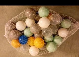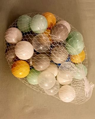 Set di palline colorate in rete, perfette per giochi e attività. - Colori assortiti: bianco, grigio, verde menta, giallo, rosa pallido. - Materiale: plastica. - Rete inclusa per il trasporto e la conservazione.