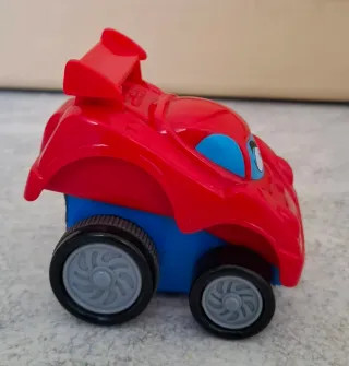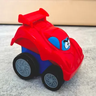 Auto giocattolo Baby Smile con un design accattivante. - Colore rosso e blu. - Spoiler posteriore. - Finestrini azzurri. - Ruote grigie con cerchioni neri.