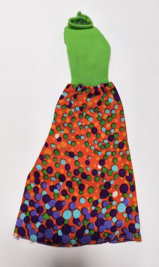 Vestito per Barbie Best Buy #3206 con fantasia a pois colorati. - Corpetto verde a coste. - Gonna arancione con pois multicolore (blu, verde, viola, bianco, arancione). - Design vivace e allegro.