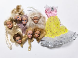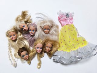 Lotto di teste di Barbie con capelli. Tutte con difetti: plug mancanti, problemi di trucco. Abito integro, Barbie clone.