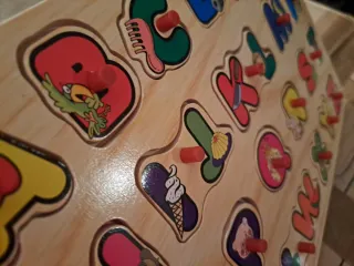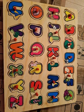 Puzzle in legno con lettere dell'alfabeto e immagini associate. - Pezzi in legno con pomelli per facilitare la presa. - Ogni lettera è accompagnata da un disegno che inizia con quella lettera. puzzle in legno con l'alfabeto inglese e immagini associate. Realizzato in legno naturale con vernice a base d'acqua. Progettato per aiutare i bambini a riconoscere lettere e associare immagini. Sviluppa la capacità di associazione e la coordinazione. Le tessere sono dotate di piccole maniglie rosse per una facile manipolazione.
