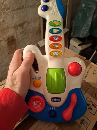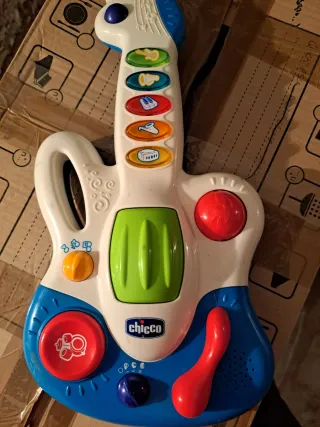 Chitarra giocattolo Chicco, ideale per i più piccoli. - Design colorato e divertente. - Pulsanti con diverse funzioni. - Manico comodo da impugnare. chitarra giocattolo musicale Chicco Baby Star Chitarra. Permette al bambino di personalizzare la musica. Include 23 melodie preregistrate. Offre tre generi musicali: Rock, Reggae, Blues. Dispone di tre modalità di utilizzo: accordi, melodie preregistrate e orchestra.