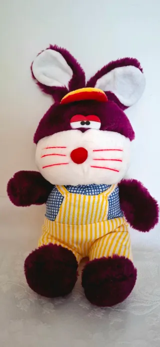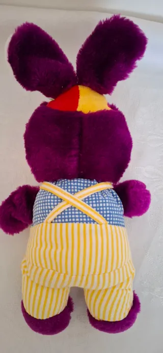 Grazioso pupazzo coniglio vintage, originale anni ’70/’80 circa. Realizzato in peluche morbido, con viso ricamato e occhi in plastica, tipici dei giocattoli dell’epoca. - Materiale in peluche viola e bianco. - Indossa una salopette a righe gialle e bianche. - Ha una camicia a quadri blu sotto la salopette. - Dettagli ricamati sul muso e un naso rosso. - Cappellino con visiera arancione e rossa. Un pezzo autentico che racconta il fascino dei giocattoli di una volta 🧸