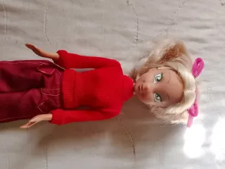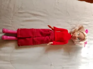 Bambola della Winx con vestito rosso. - Capelli biondi con fiocchi rosa. - Indossa un maglioncino rosso e pantaloni rosa. - Scarpe rosa.