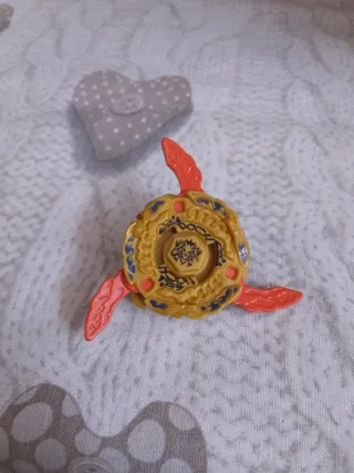 Beyblade Hades Kerbecs VGC, un peonza de batalla. - Diseño en color amarillo con detalles en azul y rojo. - Parte central con un emblema. - Borde con un patrón decorativo.