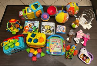 Lotto misto di giocattoli per bambini dai 0 ai 3 anni; volendo puoi comporre il tuo set. - Include libri illustrati come I giocattoli fanno il bagnetto, Colorami e Il libro delle canzoncine. - Presenti forme da incastrare e blocchi colorati. - Alcuni giocattoli interattivi e musicali. - Include anche palline e altri accessori per il gioco.