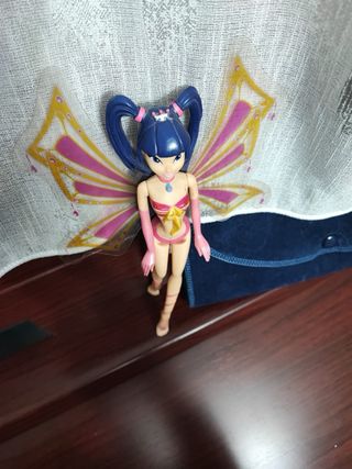Bambola Winx con ali colorate. - Ali trasparenti con dettagli rosa e gialli. - Vestito rosa. - Capelli blu raccolti.