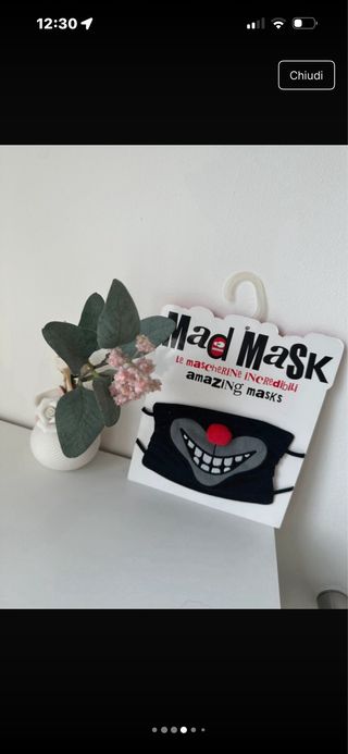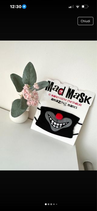 Maschera Mad Mask con un design unico e divertente. - Maschera con stampa Mad Mask. - Design ispirato a amazing masks. - Adatta per travestimenti o feste. Mascherina “Mad Mask” – Modello clown sorridente Vendo mascherina decorativa Mad Mask, nuova e mai usata, ancora sulla sua confezione originale. Design divertente e particolare: sorriso stilizzato con denti bianchi, fondo grigio e dettaglio rosso sul naso, perfetta per feste, cosplay o come accessorio spiritoso. • Condizione: nuova • Colore: nero con stampa grigia/bianca e naso rosso • Elastici laterali per una vestibilità comoda • Materiale leggero e morbido Ideale per chi