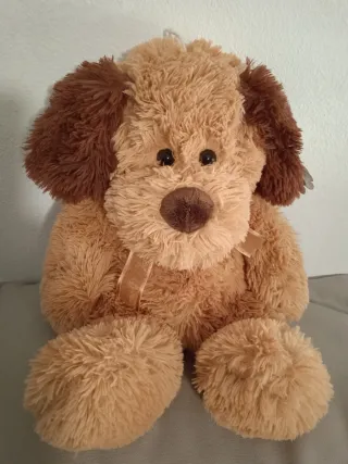 Morbido peluche a forma di cagnolino, nuovo. - Colore beige e marrone. - Dettagli ricamati sul muso. - Fiocco decorativo sul collo.