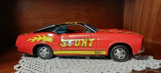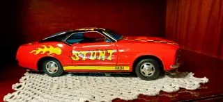Auto giocattolo vintage Ford Mustang Mach 1 con grafica STUNT e fiamme. - Modello da collezione. - Design sportivo. - Colore rosso vivace Made in Japan