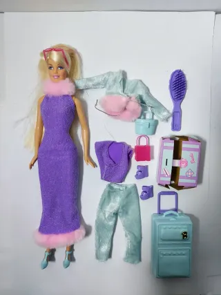Bambola mattel Barbie Travel In Style 2001 in ordine condizioni. Capelli lunghi e lisci, con acconciatura originale parzialmente intatta, mani, piedi e collo intatti. Con vestiti e accessori originali. Segnalo piccole macchie rosa sui piedi
