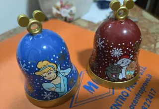 Set di due campanelle a tema Disney. - Una campanella blu con Cenerentola. - Una campanella bordeaux con gli Aristogatti. - Decorazioni a tema natalizio con fiocchi di neve e pois dorati. - Dettaglio con orecchie di Topolino dorate sulla parte superiore. Com confezione originale