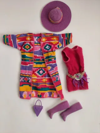 Completo Bambola Mattel Barbie Western Fun Fashions #9950, condizioni molto buone, composto da giacca, stivali, borsa, cappello e vestito. La cintura è rovinata a causa del materiale che si disintegra con il tempo