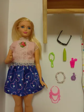Set Barbie Curvy (2015-originale Mattel) con camera da letto in legno (non Mattel) e accessori per creare tante storie. - Bambola Barbie Curvy - Letto con coperta a pois colorati - Specchio - Occhiali - Profumo - Rossetto - Bracciale - Collana