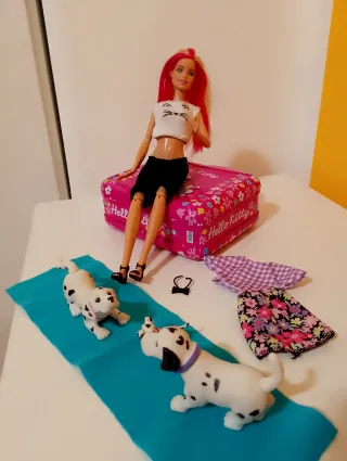 Set Barbie Dog Sitter con tre cagnolini dalmata e accessori. - Barbie con capelli rossi e outfit alla moda. - tre cagnolini dalmata, gli adulti muovono la testa. - Accessori inclusi: borsa hello kitty, vestiti collanai.