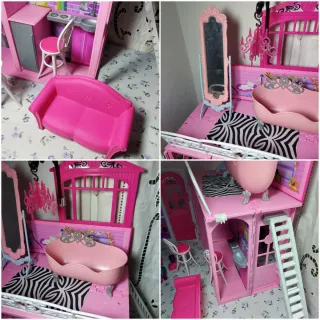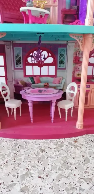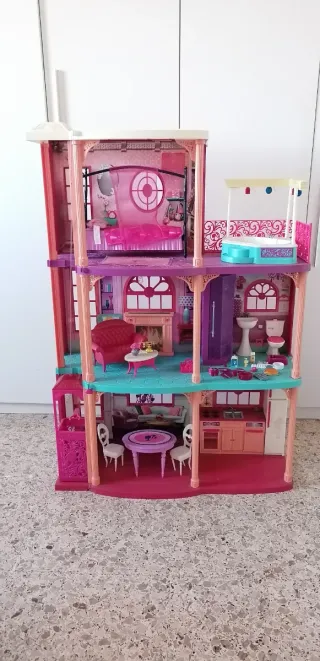 La casa dei sogni di Barbie, un'iconica casa delle bambole a più piani. Si tratta di una casa giocattolo usata con accessori, quindi presenta imperfezioni e alcuni accessori mancanti. Contattare per altre informazioni È preferibile la consegna a mano. - Struttura a più livelli con stanze arredate. - Design colorato e dettagliato. - Include accessori per il gioco.
