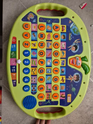 Gioco interattivo educativo per bambini, con tasti colorati e immagini. - Tasti con lettere e numeri. - Immagini di animali e oggetti. - Tasti musicali. - Personaggi con nomi.