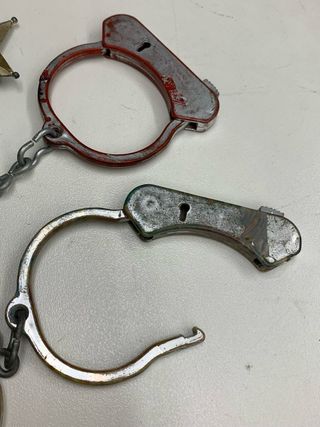 Set di manette giocattolo in plastica, con una stella da sceriffo. - Manette con finitura rossa e verde. - Stella da sceriffo dorata.