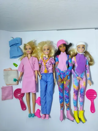 Lotto di 4 barbie con vestiti e accessori. Tutto in ottime condizioni, con vestiti e accessori, nessuna rottura e capelli non tagliati. 2 sciatrici / pattinatrici su ghiaccio con corpo articolato, 1 tema benessere e spa, 1 infermiera / dottoressa con stetoscopio.