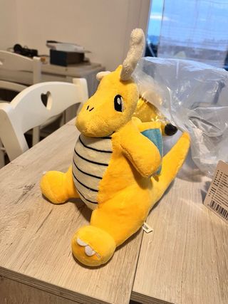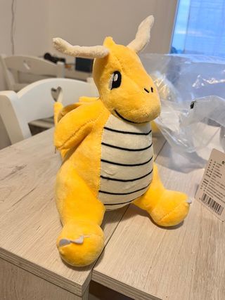 Peluche di Dragonite, il Pokémon drago volante. - Colore giallo brillante. - Dettagli neri sul ventre. - Ali e corna morbide.