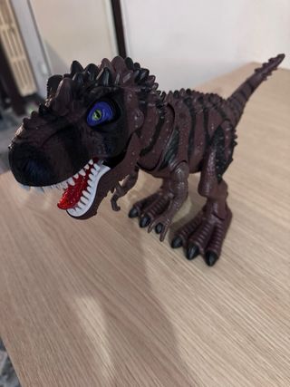 Dinosauro T-Rex gigante, con suoni, luci e movimenti. Funziona con batterie. Buone condizioni e perfettamente funzionante. Lunghezza 45 cm, altezza 25 cm.