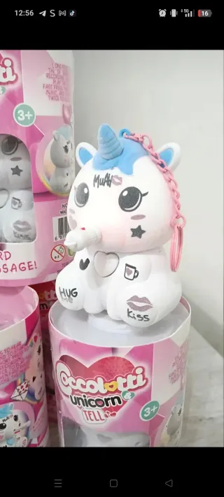 Un simpatico unicorno che registra messaggi. - Design colorato con dettagli a forma di cuore e labbra. - Include una catenella per portarlo con te. - Etichetta 3+ indica l'età consigliata.