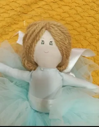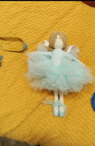 Bambola di pezza fatta a mano, con un grazioso tutù azzurro e scarpette da ballerina. - Capelli in corda bionda. - Ali in tulle bianco. - Dettagli con nastri. - Piedi con scarpette azzurre e fiocchi.