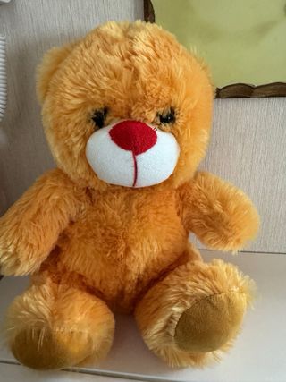 Simpatico orsetto di peluche di colore arancione. Morbido e soffice al tatto. - Naso rosso. - Dettagli delle zampe in tessuto più chiaro.