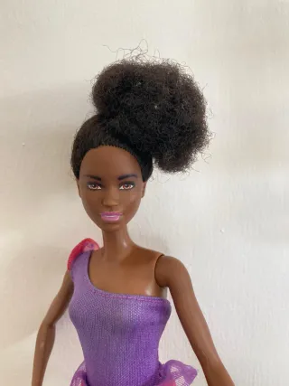 Bambola Barbie con capelli ricci e neri, indossa un vestito asimmetrico viola con dettagli rossi e una gonna grigia. Ai piedi porta delle scarpe da ginnastica viola. - Capelli neri afro. - Vestito con un solo spallino. - Gonna corta grigia. - Scarpe da ginnastica viola.