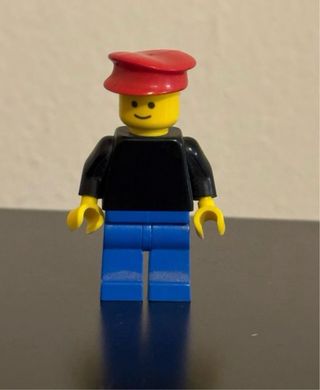 Minifigure Lego originale degli anni '80. Un pezzo da collezione per gli appassionati. - Testa gialla con espressione sorridente. - Cappello rosso. - Corpo nero. - Gambe blu.