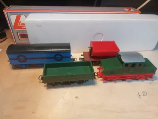 Set composto da una locomotiva Lima e tre vagoni. - Locomotiva di colore verde e rosso. - Vagone blu con cerchi rossi. - Vagone verde. - Vagone rosso su base marrone.
