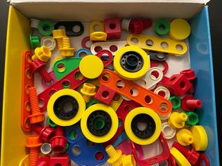 Set di costruzioni Quercetti Tecno Jumbo con viti e bulloni, ideale per bambini dai 3 ai 7 anni. Permette di costruire diversi modelli come elicotteri e auto da corsa. - 76 pezzi inclusi. - Ruote lavabili in morbida EVA. - Made in Italy.
