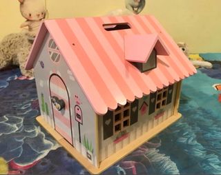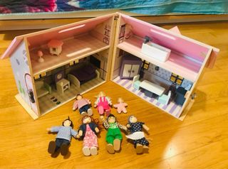 Deliziosa casa delle bambole in legno, perfetta per ore di gioco creativo. La casa è decorata con colori pastello e dettagli incantevoli. - Tetto a strisce rosa. - Finestre con persiane e fioriere. - Porta d'ingresso con simpatici pinguini come maniglie. - Posta con uccellino. - Design a forma di casetta con tetto spiovente. Completa di accessori e famiglia