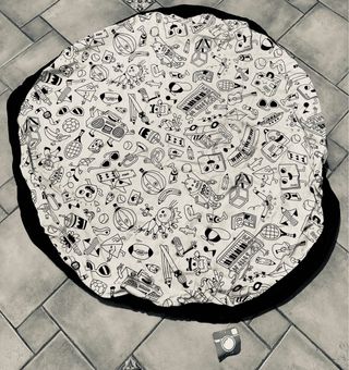 Tappeto gioco versatile che si trasforma in un sacco contenitore per giocattoli. Ideale per tenere in ordine la cameretta. Diametro: 140 cm - Design con simpatici disegni in bianco e nero da colorare a fantasia - Chiusura con cordoncino per un facile trasporto.