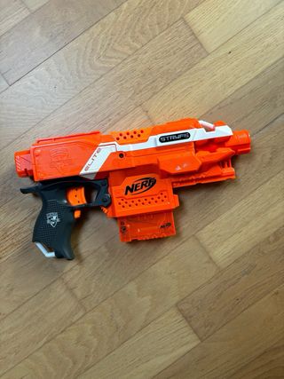 Pistola Blaster Nerf N-Strike Elite Stryfe originale, colore arancione. In buone condizioni, completo di caricatore da 6 dardi. Ideale per giochi e collezione.