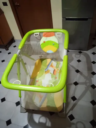 Box per neonati con simpatici giochi colorati. - Struttura in tessuto a rete. - Bordi imbottiti in tessuto verde. - Tappetino interno con disegno di animali.