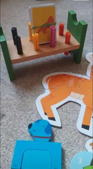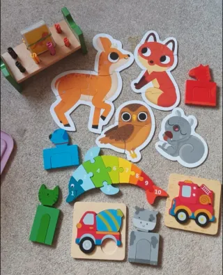 Set di giochi in legno con simpatici animali e veicoli. - Puzzle con animali della foresta: cervo, volpe, gufo, koala, delfino numerato. - Veicoli in legno: camion cemento, camion dei pompieri, cavallino. - Blocchi con animali: gatto, cane, mucca. Purtroppo manca una ruota al camion e il martello per picchiettare