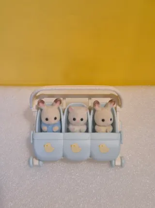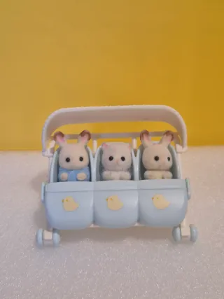 Carrozzina gemellare Sylvanian Families per far passeggiare i tuoi piccoli. Includo tre cuccioli,guarda le foto, due sono senza vestiti. - Colore azzurro pastello. - Decorazioni a forma di uccellino. - Ruote funzionanti.