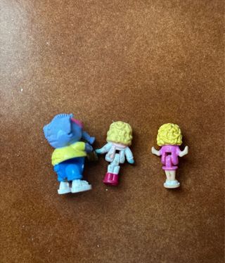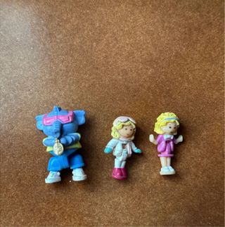 Set di 3 personaggi Polly Pocket. - Personaggio elefante blu con occhiali da sole rosa che suona il sax e abbigliamento giallo e blu. - Personaggio bambina con cappotto bianco, sciarpa rosa e cappello. - Personaggio bambina con vestito rosa e fiocco giallo.