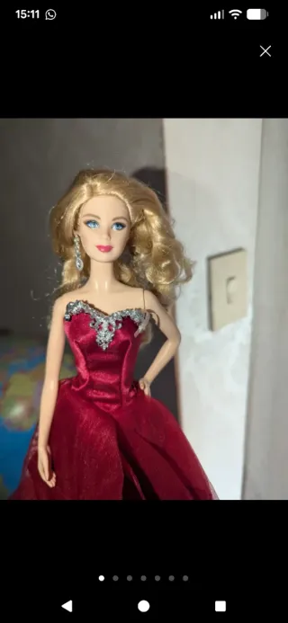 Bambola Barbie con un elegante vestito rosso. - Vestito lungo con dettagli argentati sul corpetto. - Capelli biondi ondulati. - Orecchini pendenti argentati.