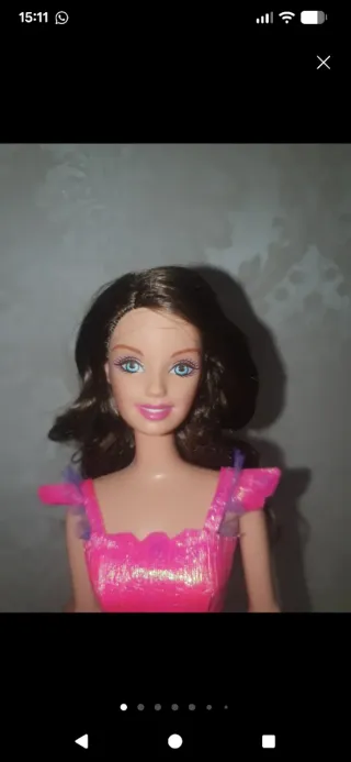 Bambola Barbie con un grazioso vestito. - Vestito a righe rosa con dettagli verdi. - Capelli biondi lunghi. - Occhi azzurri vivaci.