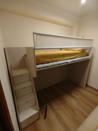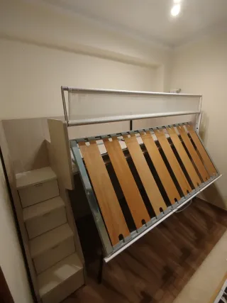 Letto a ponte della marca Moretti Compact, ideale per ottimizzare lo spazio. - Struttura in legno con rete a doghe. - Scala integrata con cassetti contenitori.