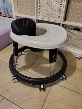 Girello per bambini con vassoio rimovibile per la pulizia. - Seduta in ecopelle nera. - Vassoio bianco con porta bicchiere. - Struttura con ruote per facilitare il movimento - Freni di stazionamento